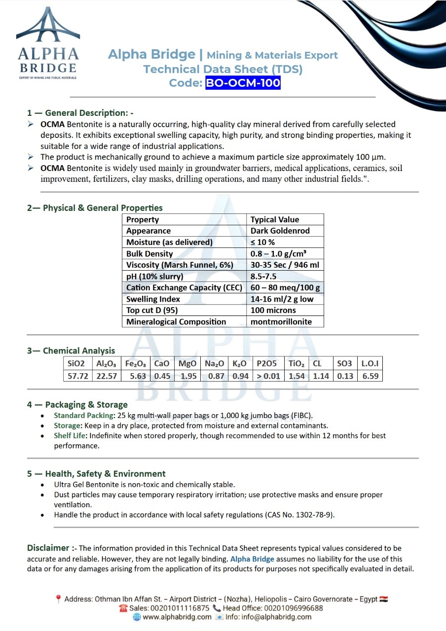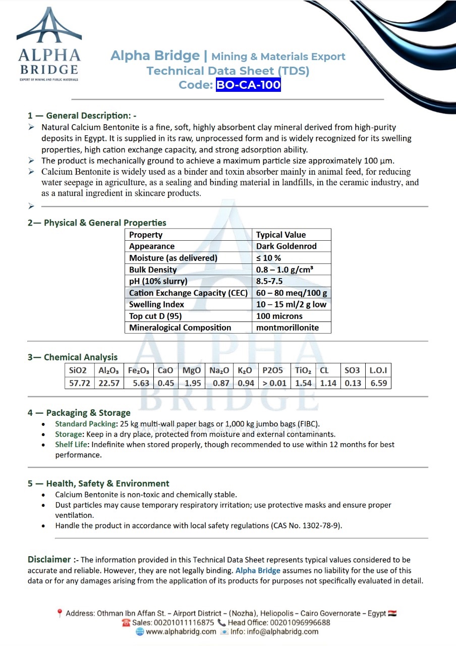 Explore the full technical specifications of our premium Bentonite grades. Download the detailed data sheets below for performance insights and application guidance. 🔹 Product-Specific Lines: 1. BENTONITE CALCIUMY α–BO–CA–100