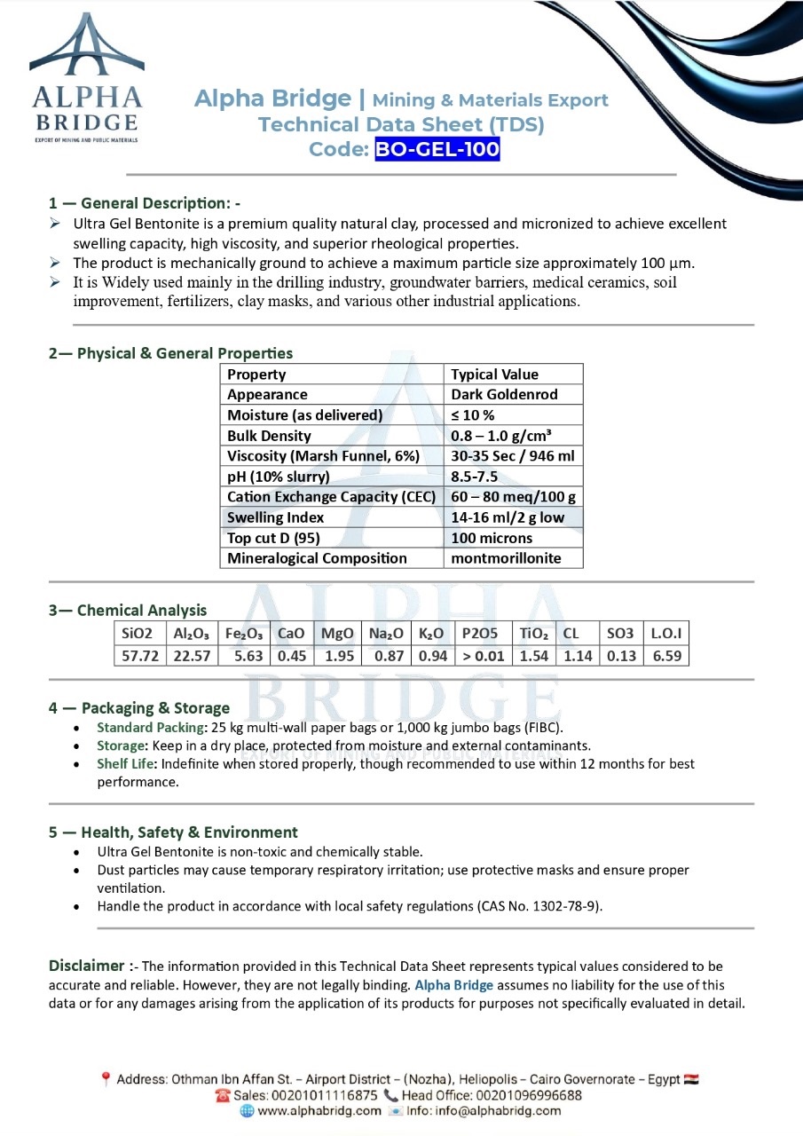 Alpha Bridge provides high-performance Bentonite used across multiple sectors — from oil and gas drilling to civil engineering, foundry, and agriculture. Renowned for its swelling capacity, rheological control, and sealing properties, our Bentonite ensures stability, filtration control, and smooth operations in every application.